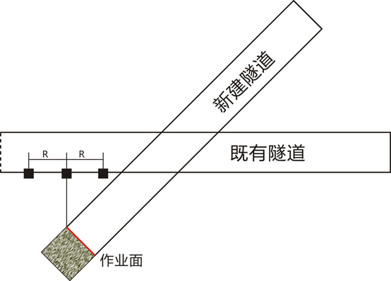 交叉前,在新建隧道还没有正式跨入(下穿)既有线隧道前开始布置监测点,最近处监测点应布置在既有隧道垂直于新建隧道工作面中心点垂直于处,并以此监测点为中心左右各布置监测点,随着新建隧道工作面的移动而移动监测断面,直到新建隧道工作面与既有隧洞交叉。此种情况在既有隧道内布设的监测点应不少于3个,监测点的数量应根据影响范围而定。