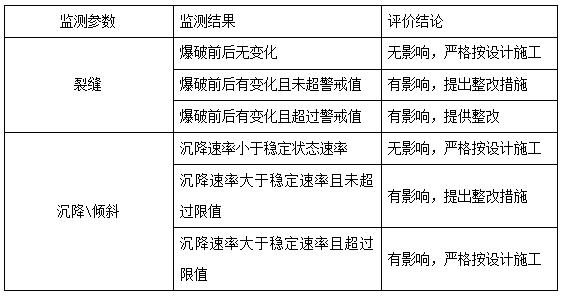 若单次爆破的振幅未超过控制值且裂缝在爆破前后无变化,表明该次爆破未对保护物造成影响,若单次爆破的振幅超过控制值或裂缝在爆破前后有变化,则表明该次爆破针对保护物造成影响;