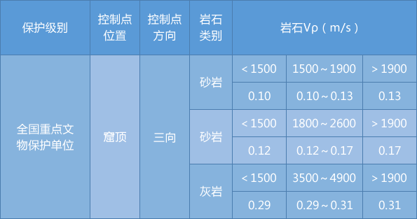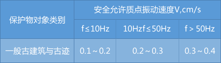 由爆破施工引起的振动控制指标按照《爆破安全规程》中选取,应选用最大值作为评判标准。省级以上(含省级)重点保护古建筑与古迹的安全允许质点振速,应经专家论证后选取。