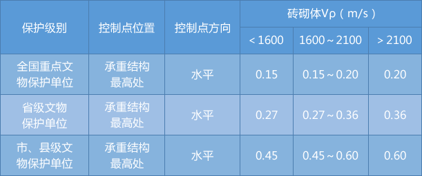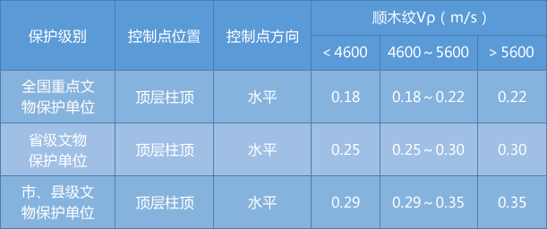 由其它或工业引起的振动控制指标按照《古建筑防工业振动技术规范》(GBT 50452-2008)中古建筑物结构的容许标准选取。
